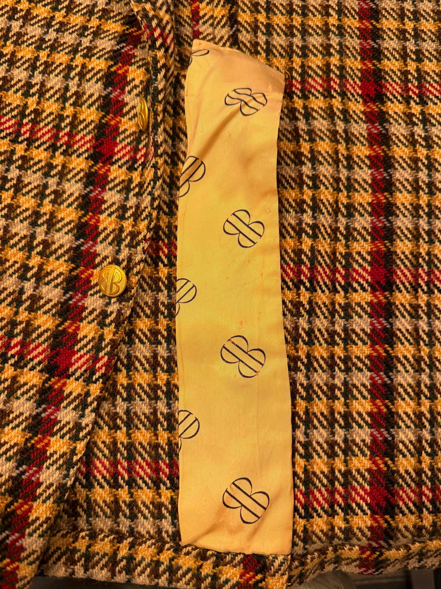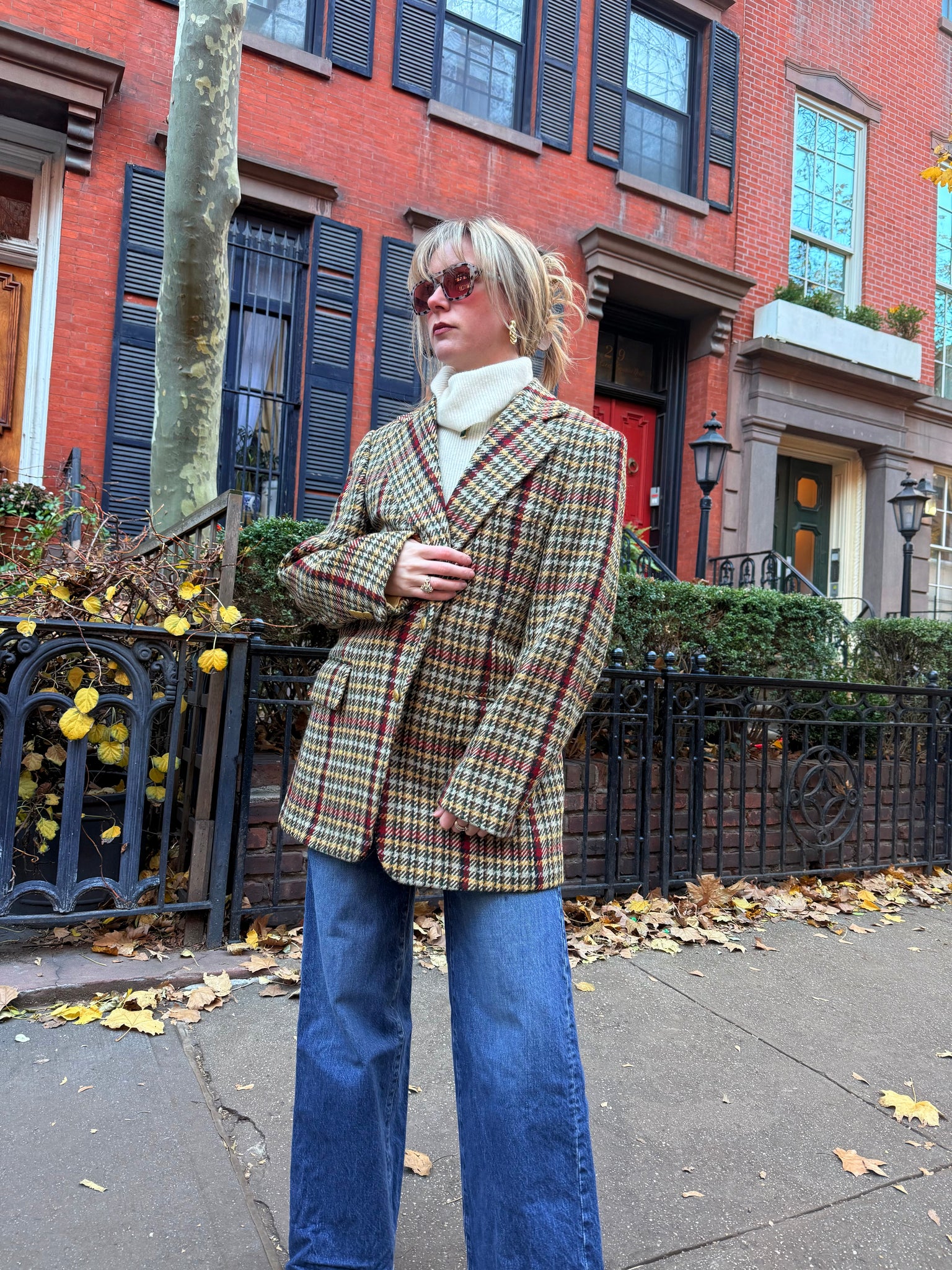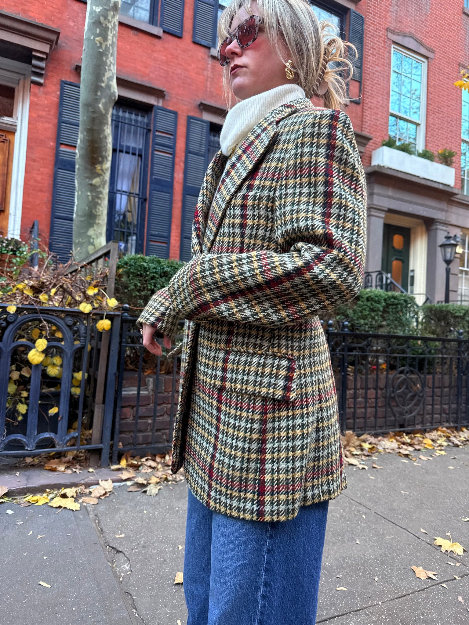 Vintage Bill Blass wool blazer in a rich houndstooth plaid with pops of red. Structured shoulders, notched lapels, and a long-line, tailored silhouette give it that chic menswear-inspired feel. Features gold-tone buttons and two front flap pockets. Half-lined for a lighter, more comfortable fit that still maintains its shape. A standout, seasonless layering piece that dresses up denim or complements classic trousers effortlessly.