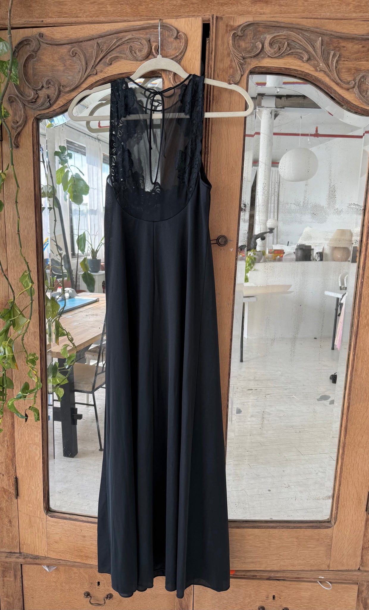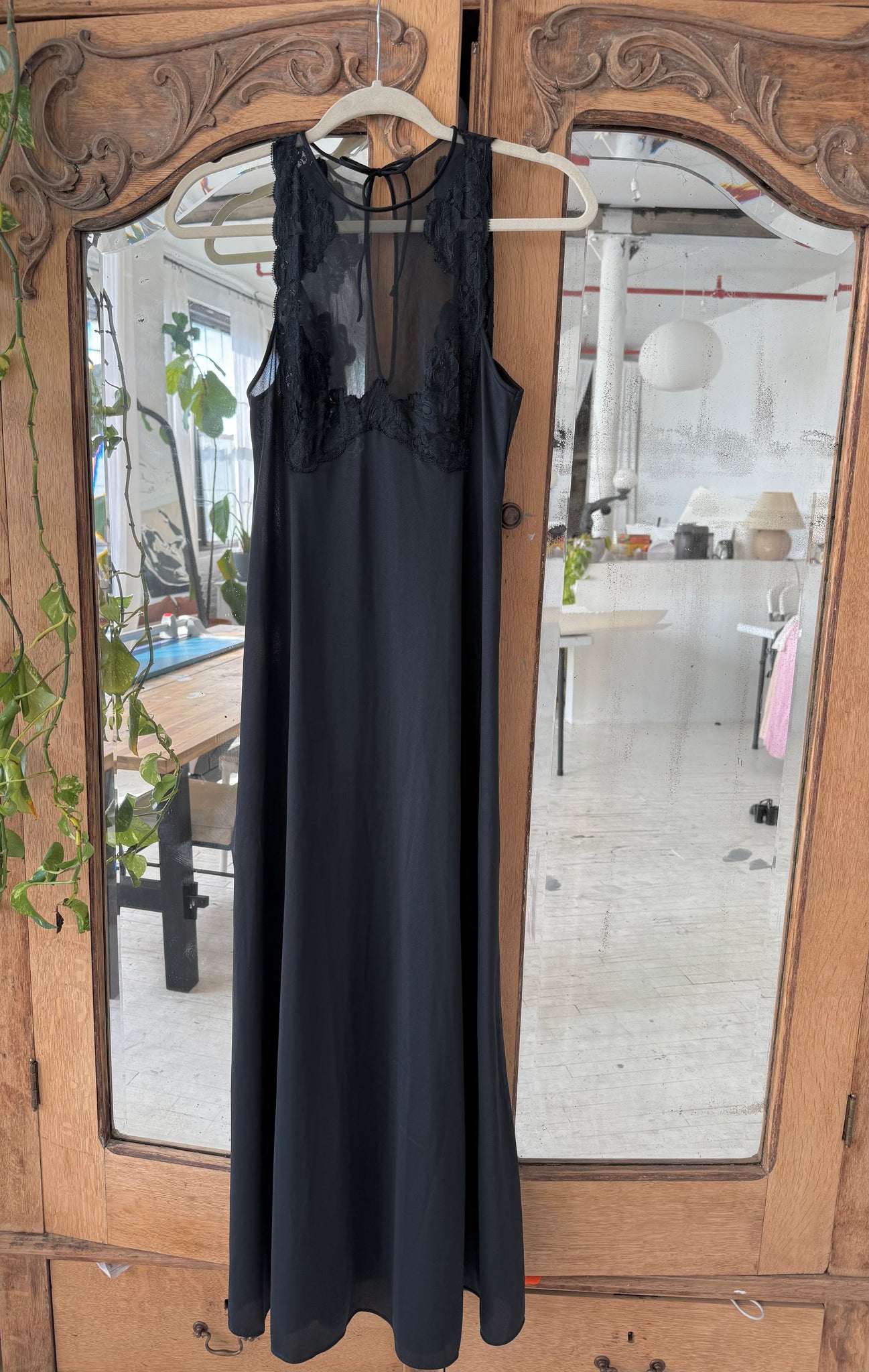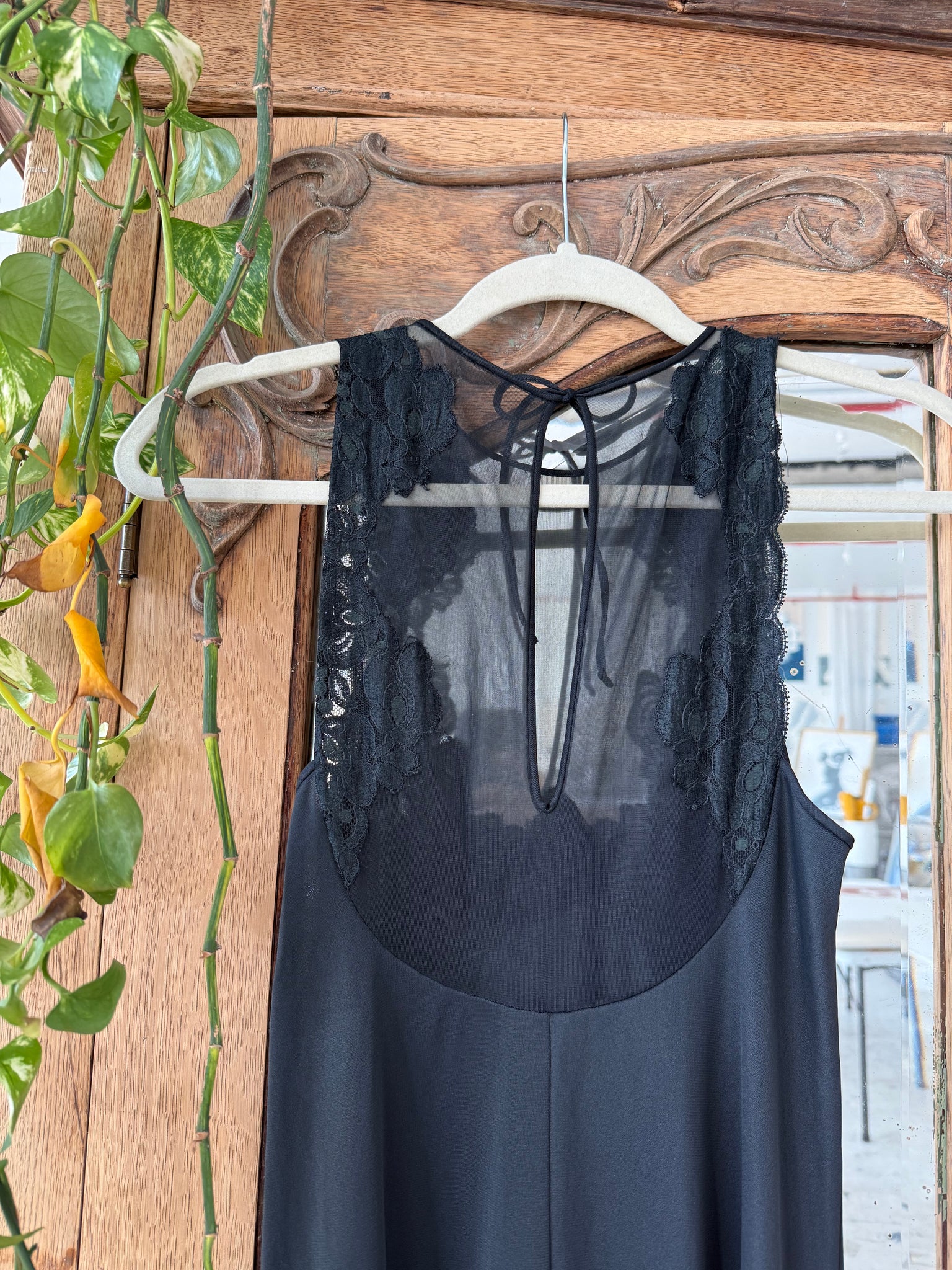 Black high-neck vintage slip dress with an empire waist and softly flared A-line skirt. The neckline features a delicate lace overlay that offers subtle coverage across the bust. Tagged a small, best suited for XS–S.